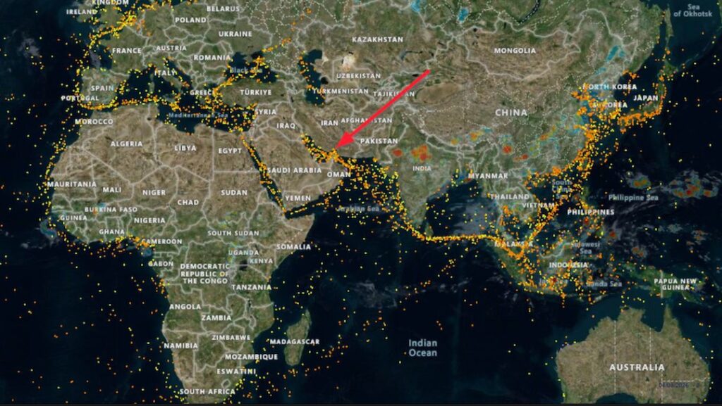 Momentopname van wereldscheepvaart met Straat van Hormuz; normaal gaat hier 20% van Olie/LNG volume doorheen, nu gesloten.
